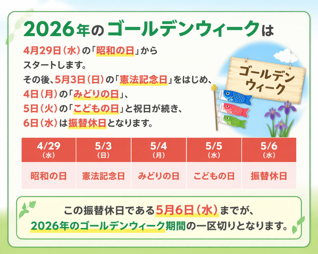 この振替休日である5月6日(水)までが、【2026 GW】ゴールデンウィーク期間の一区切りとなります。