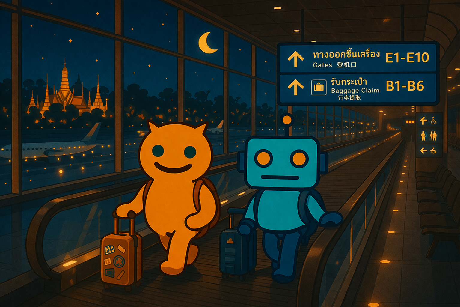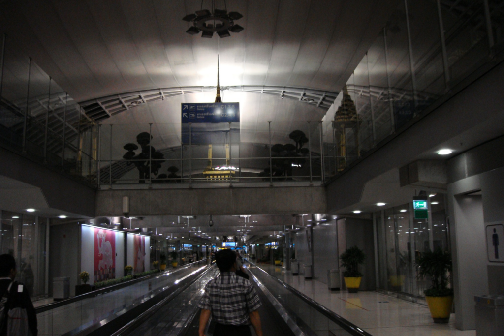 動く歩道に身を委ねながら、目の前に広がる光景をぼんやり眺めていました 🚶‍♀️。頭上に掲げられた青い案内看板が行き先を示しているけれど、どこか未来への道しるべのように感じられました 🛤️。タイ文字と英語が並ぶサインが、旅先の文化を感じさせてくれるのです。